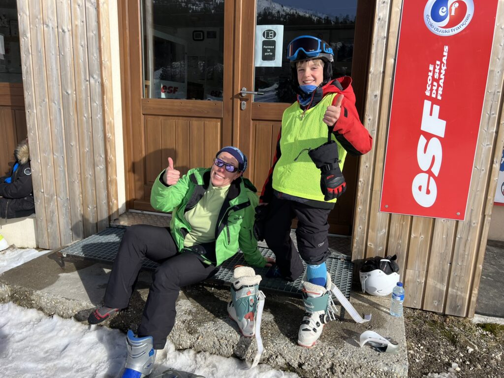 adaptabilité (photo 1,2,3 ) : chaussure explosée, Magali « s’est sacrifiée » pour prêter les siennes afin que le jeune puisse continuer son cours sans perte de temps, l’avantage dans cette station familiale, c’est qu’on s’entraide aussi avec les professionnels puisque Antoine a réglé son ski également.